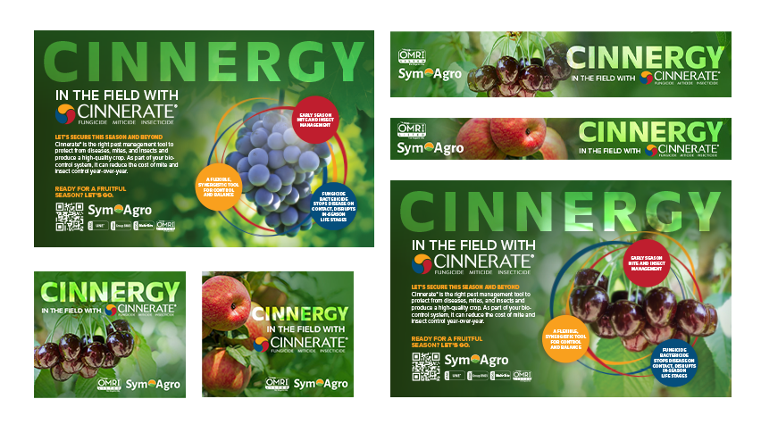 As the art director, I helped build the Cinnergy in the field with Cinnerate campaign: a visual system centered on spheres of protection symbolizing control, balance, and efficiency. We adapted the design by crop type and season, integrated weather-driven messaging, and gave Sym-Agro a flexible toolkit of assets: digital ads, print ads, mailers, tech sheets, sell sheets, e-blasts, and newsletter templates.